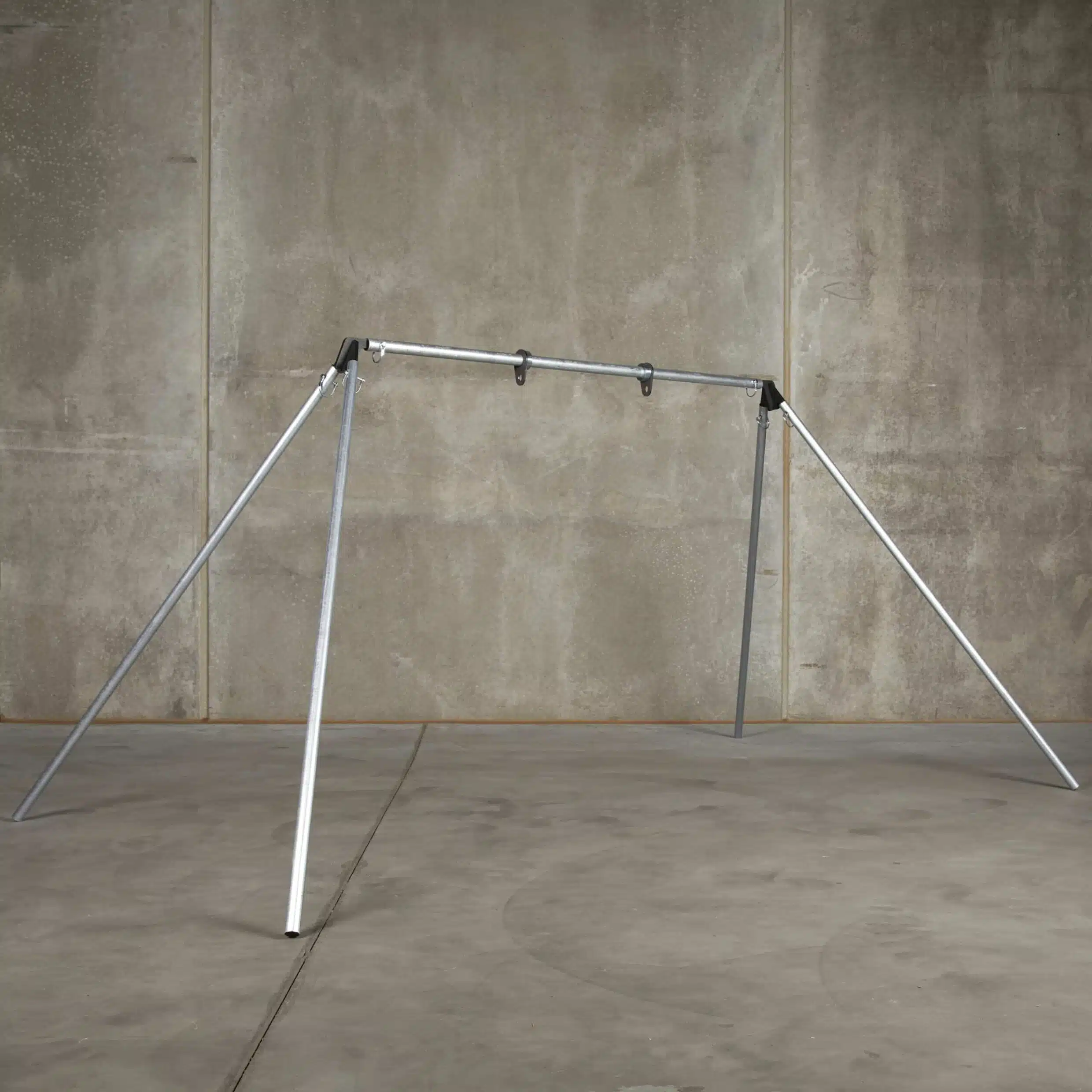 This target gong stand was designed to be easy to use, lightweight, and portable. The stand is easily taken down using the supplied locking pins. The targets are suspended from the stand using laser cut 1/4” AR400 gong mounts. The mounts are free to spin around the stand which prevents chain from being tangled when using heavy loads. This stand is constructed using the four included 60″ lengths of EMT electrical conduit for the legs, and one 60″ length of Rigid Conduit for the crossmember. See our Rigid Conduit Double Gong Stand Kit for the option of hanging multiple targets at a time.